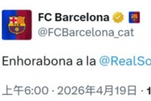 体育资讯4月19日讯 国王杯决赛已经完赛,马竞在点球大战中3-4不敌皇家社会。巴萨官推在赛后第一时间发推:“祝贺@皇家社会赢得国王杯冠军。”